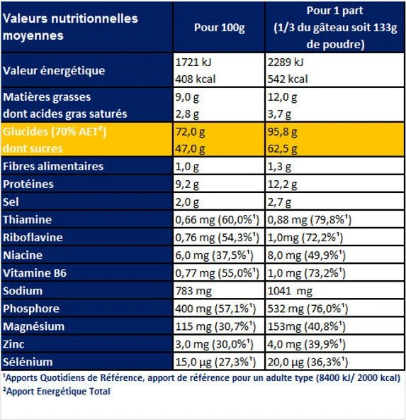 Preparation of flour (wheat flour, wheat gluten, broad bean flour, malted wheat flour, yeast, enzymes, antioxidant (ascorbic acid)), sugar, fructose, salted butter caramel powder (12%) (sugar, syrup glucose, sweetened condensed milk, salted butter, water), whole egg powder, natural caramel flavor, vegetable fat (sunflower oil, glucose syrup, milk protein, anti-caking agent (silicon dioxide), stabilizer (sodium phosphate) potassium)), skimmed milk powder, baking powders (sodium bicarbonate, di-sodium di-phosphate), flavor (milk), minerals (tri-magnesium dicitrate, zinc sulfate, sodium selenate), salt, vitamins (B3, B6, B1, B2). Contains wheat, milk and egg.
