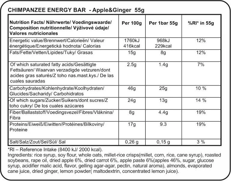 Refreshing, Awesome, simple, delicious full of energy. All natural ingredients, no trans fats, no GMO, it’s made from real food. The Chimpanzee Apple Ginger Energy Bar contains a high amount of protein and fiber and is a great source of natural energy.