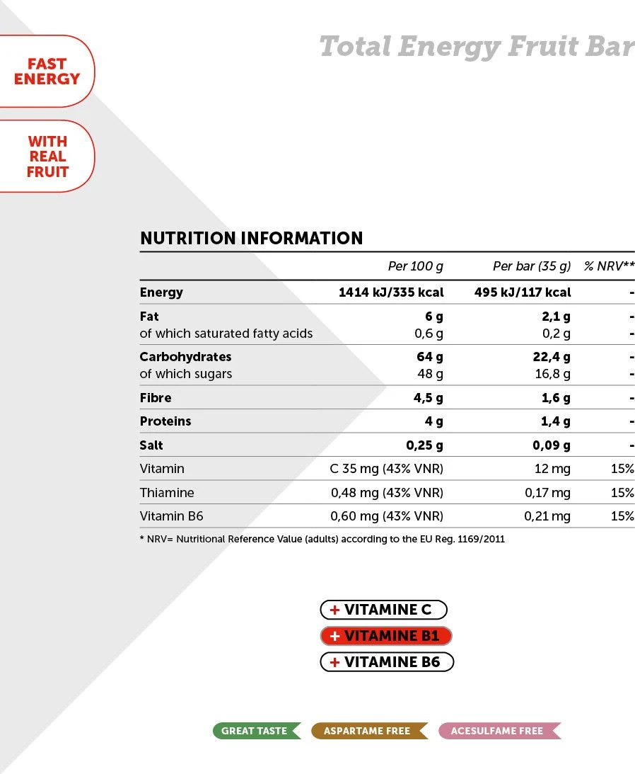 A delicious energy bar with rice souffle? and real fruit, enriched with vitamins B1, B6 and vitamin C, specially formulated to be consumed before and during the effort for a quick energy supply during the activity? athletic.