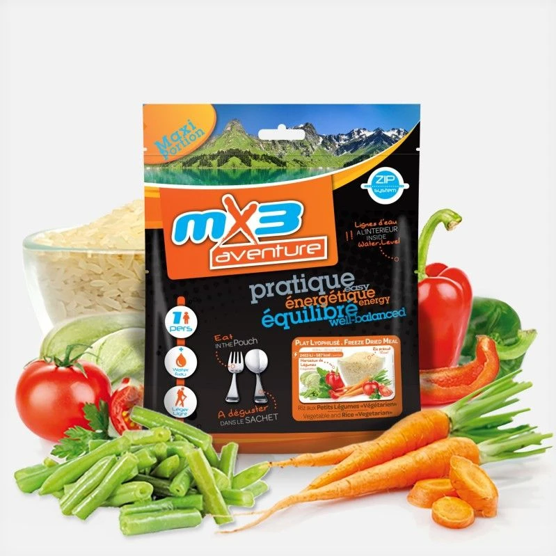 MX3 freeze-dried vegetarian rice is a recipe rich in aromatics and vegetables: tomatoes, carrots, zucchini, red and green peppers and green beans. Perfect for lovers of vegetarian cuisine with taste!