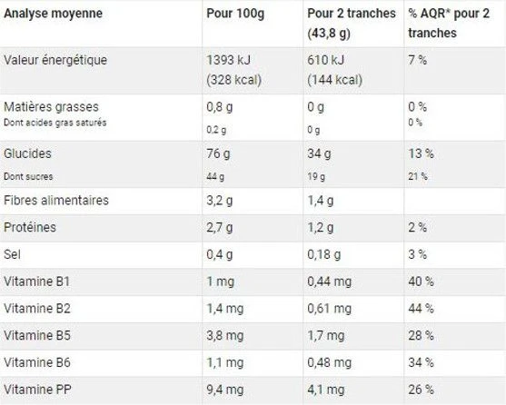 Composition : Glucose-fructose syrup, rye flour * 40.7%, pearl sugar 7%, baking powders (diphosphates, sodium carbonates), natural flavors, vitamins B1, B2, PP, B5 and B6.
