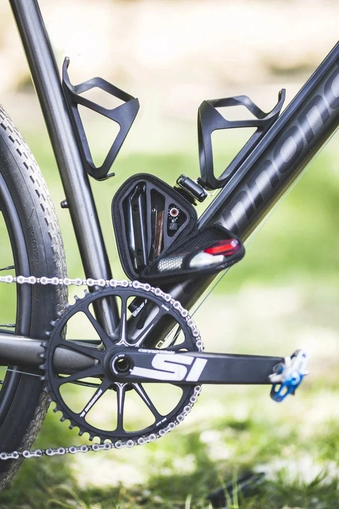 The Lyne Triangle Storage Box Kit is a 260mm Holy Rail with a side entry bottle cage, Quick-Draw multitool, and triangle storage box.