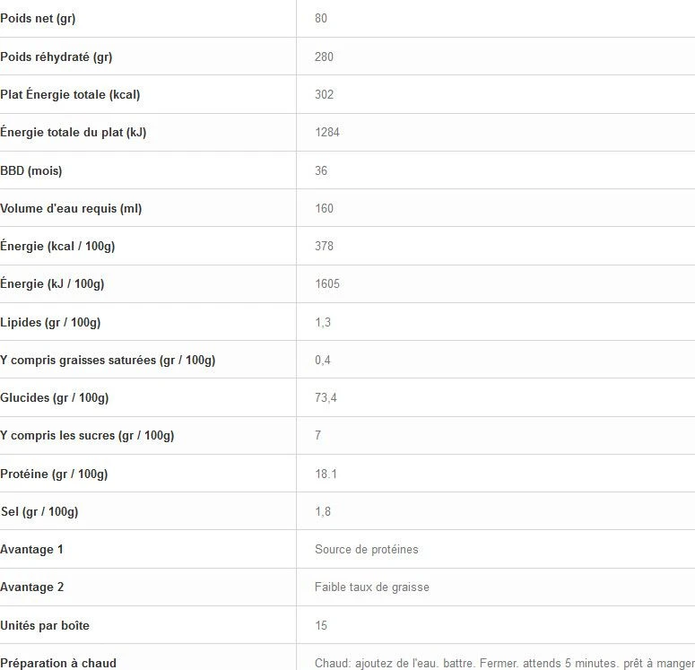 Pre-cooked rice 69.6%, lyophilis chicken 12.5% (EGG), tomato, onions, peppers, salt, herbs, 0.1% chili.