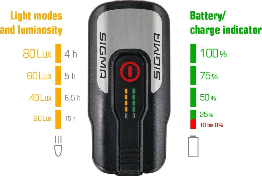 A beam range of 90 meters at 80 lux will satisfy any frequent rider. The Sigma Aura 80 USB is the bike light of choice for commuters and for athletic training rides in the evening. Precise LED indicators on the top show you just how much battery charge is left and which of the four light modes you have selected. The lateral Light Guide not only makes the front lights, which comply with German road traffic regulations (StVZO), attractive, but also ensures that you are better visible to others on the road.