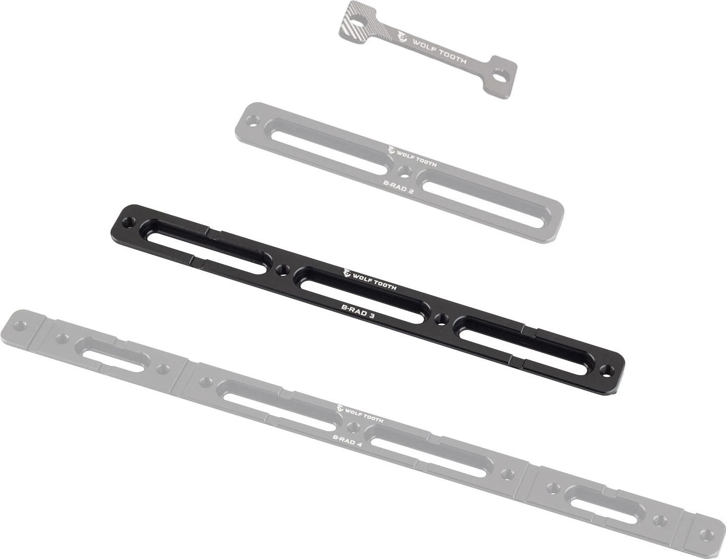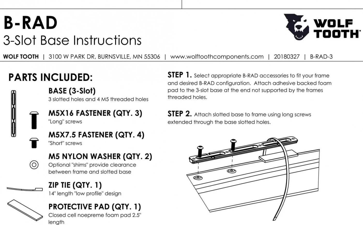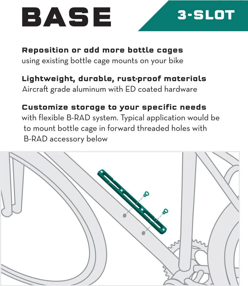 With 4 threaded holes, the 3-Slot Base of the Wolf Tooth B-RAD 3 provides additional adjustment and mounting options vs the B-RAD 2. A typical application would be to mount a bottle cage in the forward threaded holes with a B-RAD accessory tucked behind it. This mounts perfectly to triple bottle mounts on frames and forks. The B-RAD 3 includes a zip tie, channels for the zip tie, and a foam pad for secure mounting.